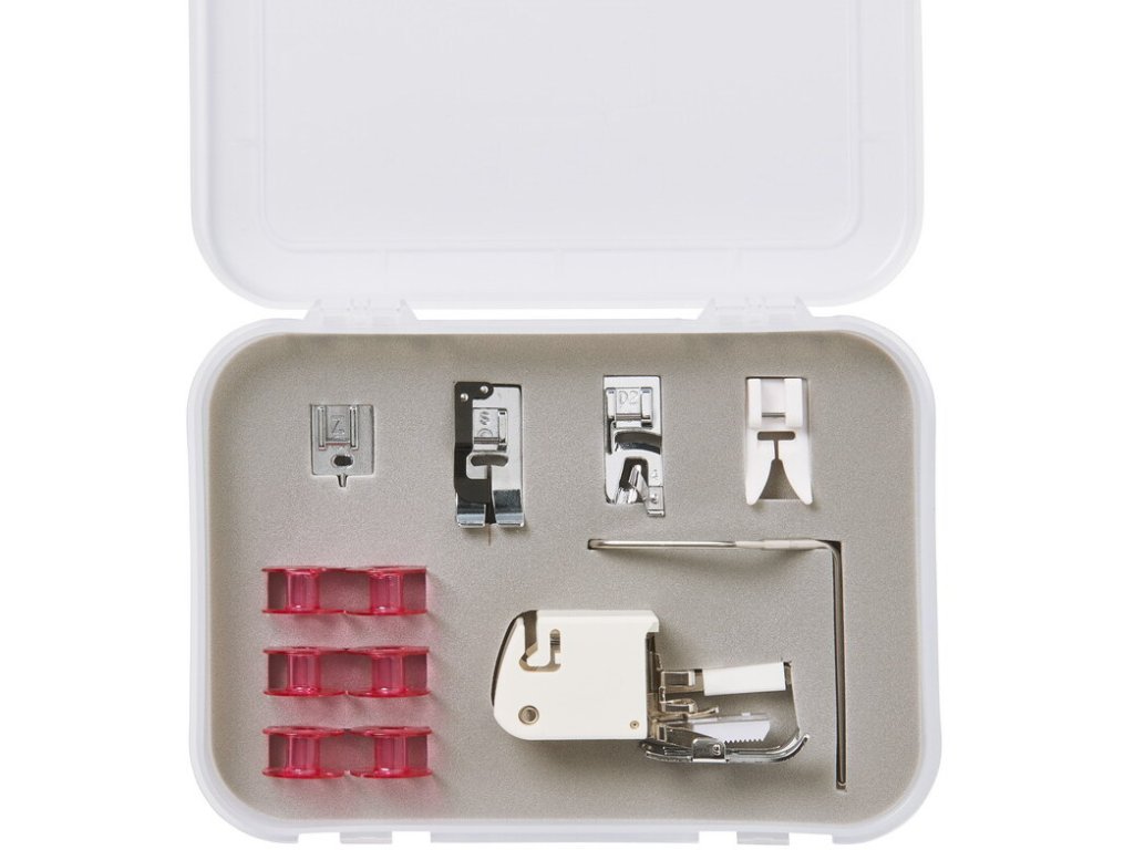 - 3 zarážky hornej nite, druhý kolík na hornú niť, štetec, párač, vodič predchádzajúceho stehu, podložka nite a prívodný kábel