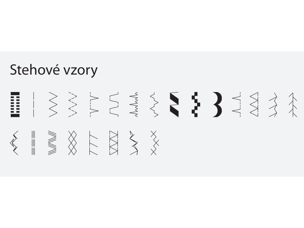 - Počet stehov: 23 stehov: základné, elastické (strečové), overlockové, vyšívacie/ozdobné