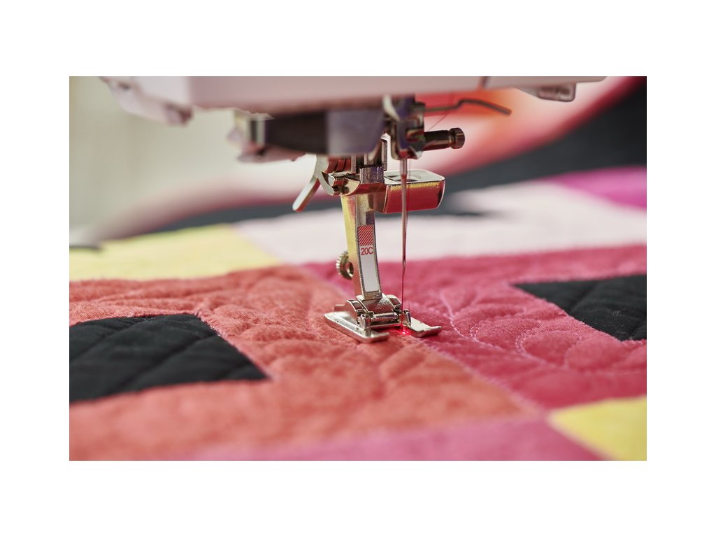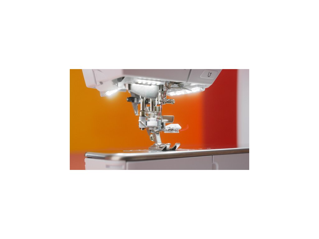 - Podpora patentovanej pätky BSR (Bernina Stitch Regulator): laserová pätka regulujúca rýchlost šitia pre rovnakú dĺžku stehu pri quiltovaní pri ľubovolnej rýchlosti posuvu