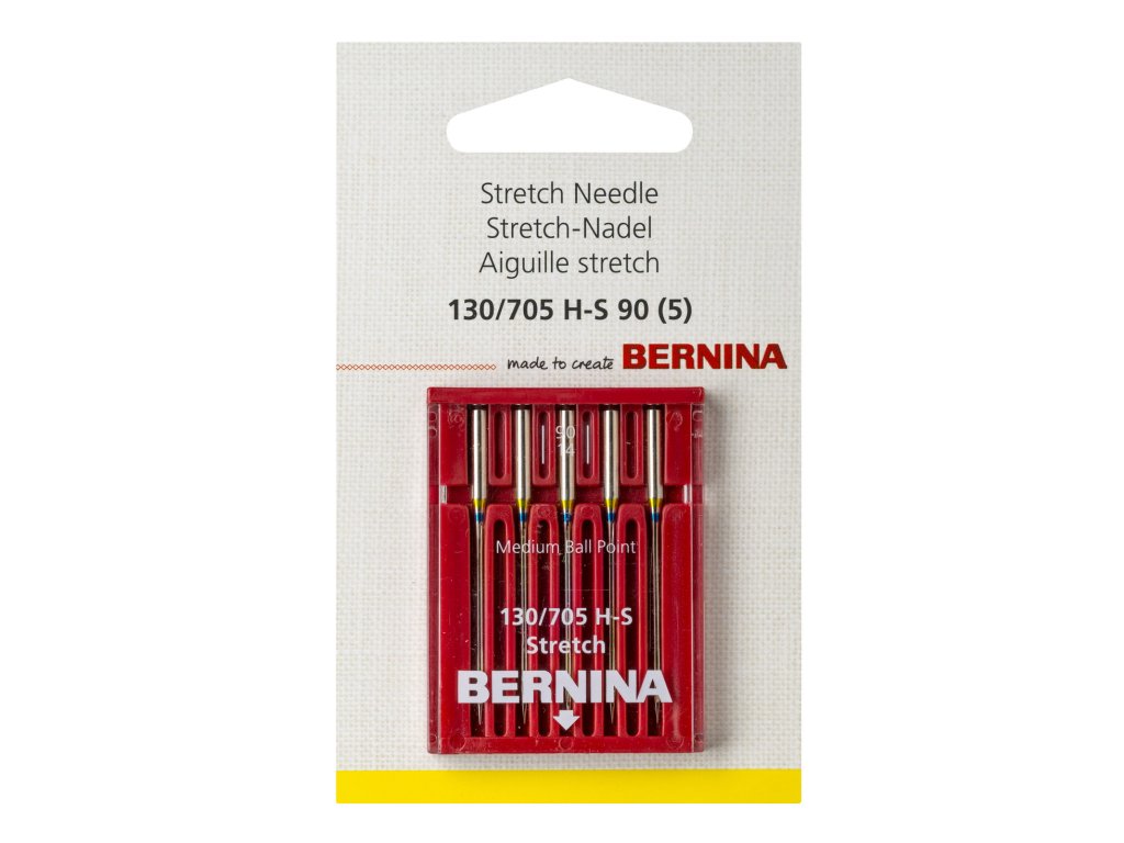 Bernina IHLA STRETCH 130/705 H-S hrúbky 90. Strečová ihla na elastický, pružný materiál, pleteniny, úplety alebo tenký materiál. Veľmi vhodná na materiály kde hrozí "pustenie" očka. Má mierne zaguľatený hrot - látku iba roztiahne ale neprepichne. Hrúbky: 90/14 Stretch, balenie po 5 ks.