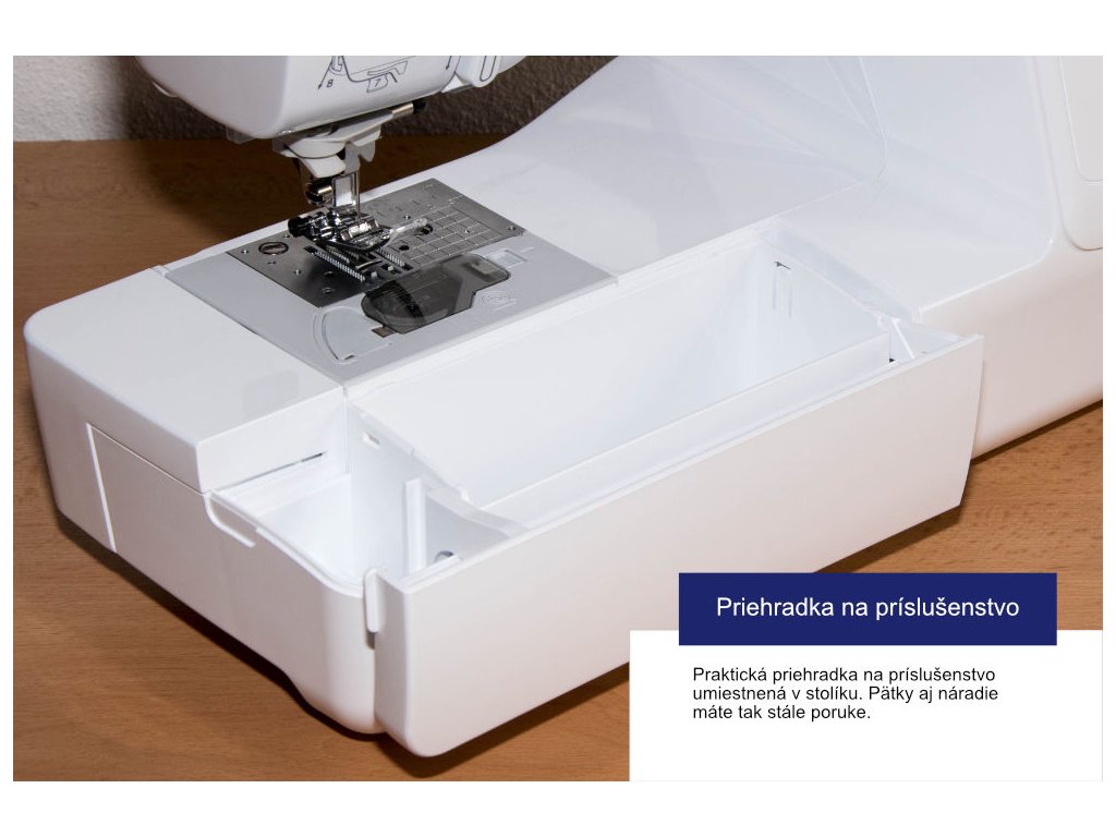 - Možnosť zapošívania uprostred šitia pomocou tlačidla na hlave stroja.