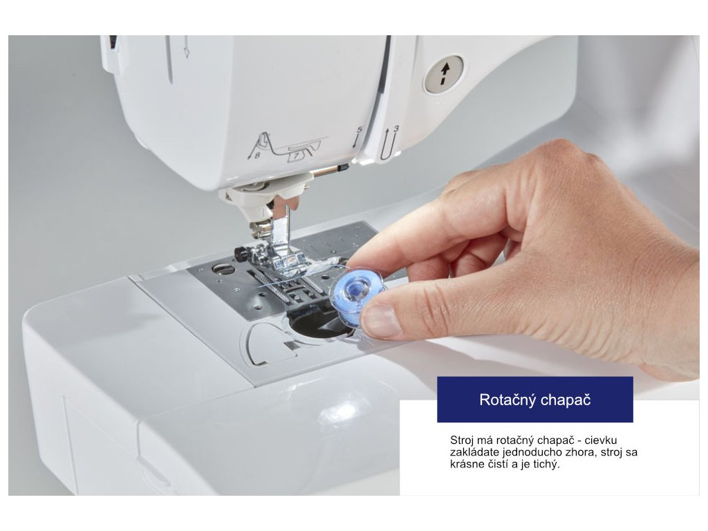 - Rýchla príprava stroja pre šitie - jednoduché vloženie cievky spodnej nite do cievkového puzdra bez otáčania tlačidlom. Priehľadný kryt umožňuje sledovať zásobu nite na cievke v cievkovom puzdre.