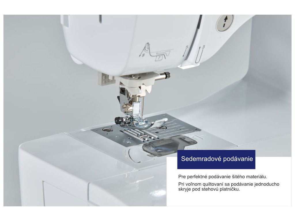 - Sedemriadkový podávač zabezpečuje perfektné podávanie šitého materiálu.