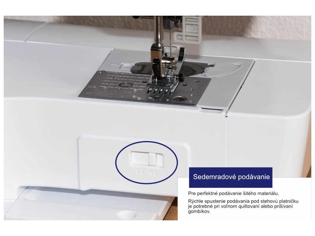 - Rýchle spustenie zúbkov podávača pod stehovú dosku je výhodné pri voľnom quiltovaní alebo našívaní gombíkov.