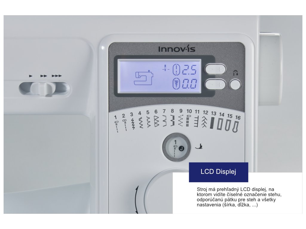 - Regulácia rýchlosti stroja pomocou posuvného tlačidla - stroj môže šiť naozaj krokom, čo je skvelé pre začiatočníkov alebo pre šitie drobných dielov.