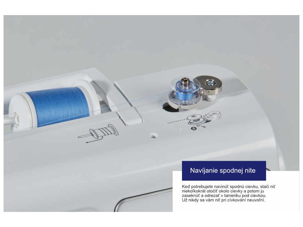 - Veľmi jednoduchý systém navíjania spodnej nite na cievku - pri cievkovaní sa odpojí ihlová tyč, ktorá sa pri samostatnom cievkovaní nepohybuje, teda nie je nutné vyvliecť niť z ihly. Stroj má na cievkovanie tanierik, kde zaseknete niť aby sa nevymotávala a zároveň ju orežete. Už nikdy nebudete musieť niť prevliekať dierkou v cievke!