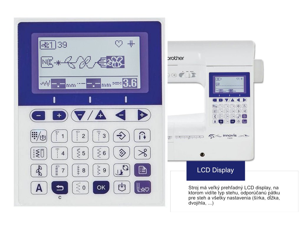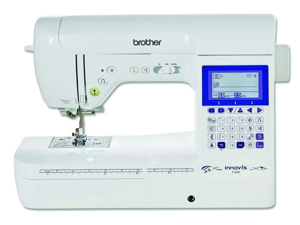 Šijací stroj Brother F420 je moderný stroj na šitie pre pokročilých so 140 druhmi stehov a 10 typmi automatických gombíkových dierok. Disponuje 5 typmi abecedy, LCD displejom, voľným ramenom, automatickým navliekaním nite, elektronickou reguláciou rýchlosti a extra veľkým zdvihom pätky.