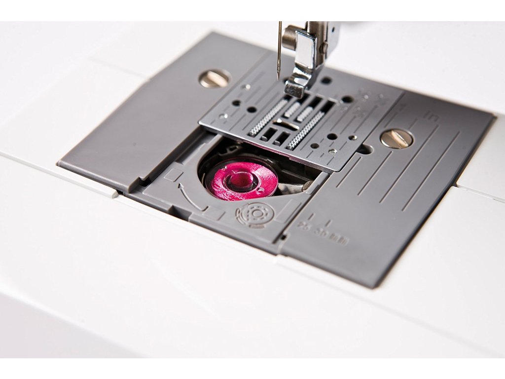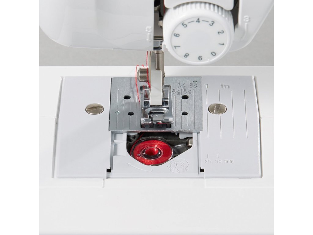 • priehľadnou krytkou vidíte, koľko nite vám zostáva na cievke