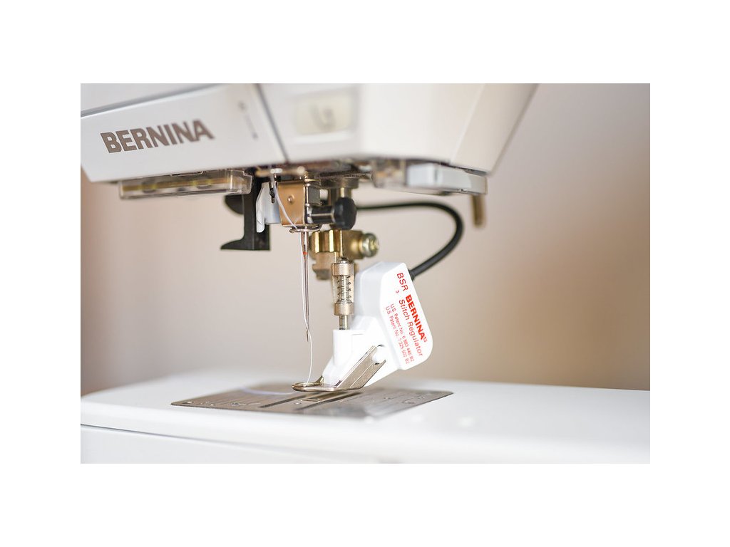 Berninou patentovaná laserová quiltovacia pätka (BSR = Bernina Stitch Regulator) zabezpečuje rovnakú prednastavenú dĺžku Vášho stehu pri voľnom quiltovaní - keď sú na stroji spustené zúbky podávača. Pracuje s optickým senzorom, ktorý sníma rýchlosť, akou pohybujete látkou a podľa toho za Vás zabezpečuje rýchlosť šitia a tým aj rovnakú dĺžku stehu.