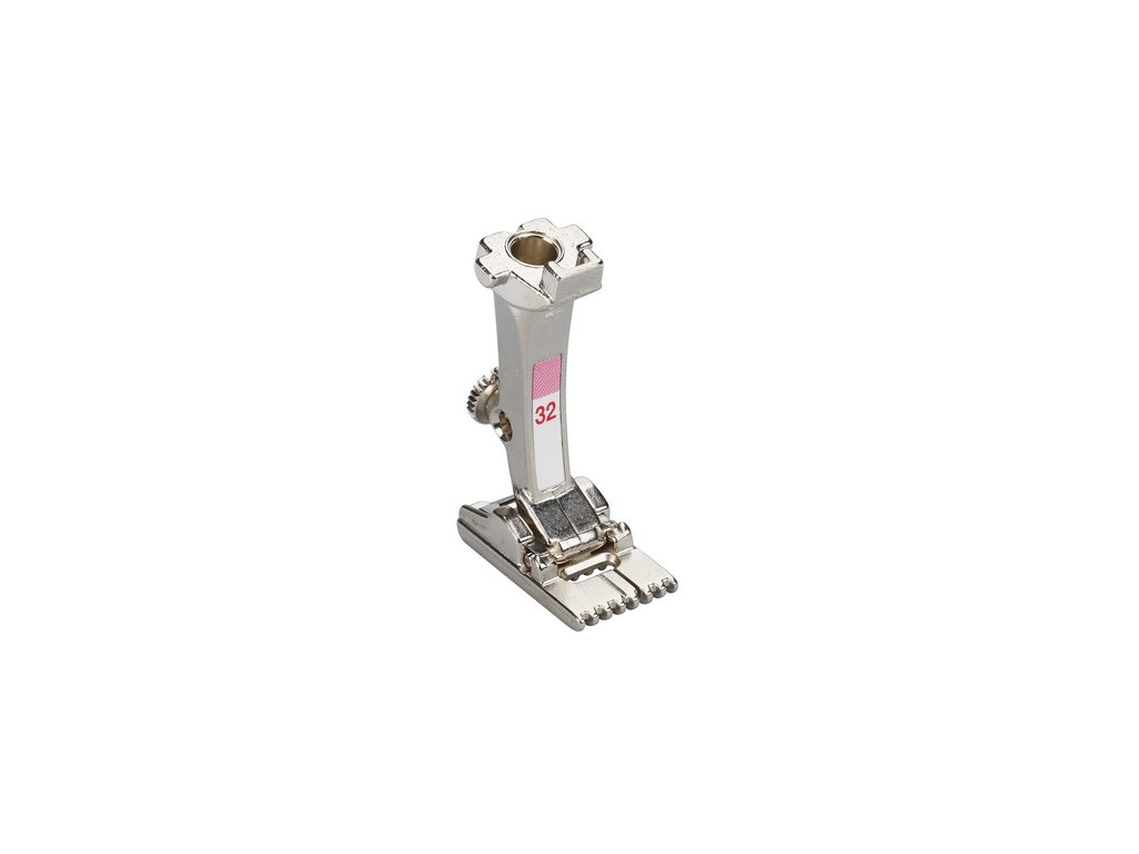 7-drážková pätka na zámiky #32 je špecialista na šitie najmä jemných zámikov na ľahké a stredne ťažké tkaniny s použitím dvojitej ihly šírky 2mm. Typický tvar zámikov sa vytvára spodnou niťou, ktorá zaťahuje dohromady dva riadky stehov počas šitia.