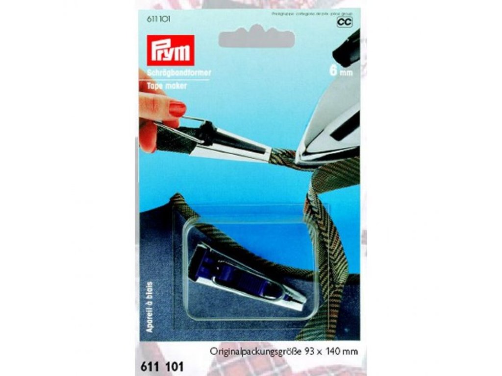 Prípravok na výrobu šikmého prúžku 6mm: je zhotovený tak, že do hornej strany nasúvate pásku z látky šírky 13mm a z dolnej strany vychádza šikmý prúžok so založenou spodnou aj hornou hranou. Jediné, čo treba urobiť - zafixovať sklady žehličkou. Výsledná šírka hotového obojstranne zahnutého prúžku je 6mm.