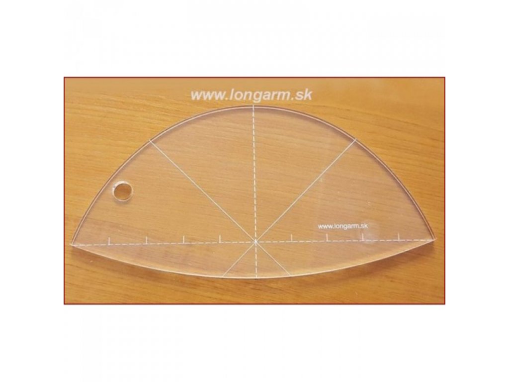 Zvislá os delí pravítko na dve rovnaké polovice. Vodorovná os oddeľuje veľký a malý oblúk. Na vodorovnej osi sa nachádzajú pomocné čiarky vo vzdialenostiach 1palec (25,4mm) Stredom prebiehajú linky pod uhlom 45 stupňov. Na konci pravítka je otvor na zavesenie / vodič pre obrysové quiltovanie a aplikácie. Quiltovacie pravítko je vyrobené z najkvalitnejšieho materiálu a pri dodávke podlepené ochrannou fóliou. Hrúbka materiálu 6mm chráni Vaše šijacie stroje pred poškodením ihlovej a pätkovej tyče.