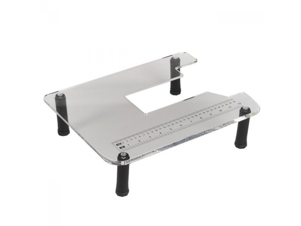 Veľký priezračný šijací a vyšívací stolík na Bernette 65,80e, 90e, 66, 82c,92e ; Edícia Miláno: Milan 5, Milan 7, Milan 8; Edícia Moskva: Moscow 8,7,5. Edícia Rím: Rome 8,7,5. Rozmer 38x30cm s výškovo nastaviteľnými nožičkami, zaoblenými rohmi a merítkom, vhodný na väčšie látky.