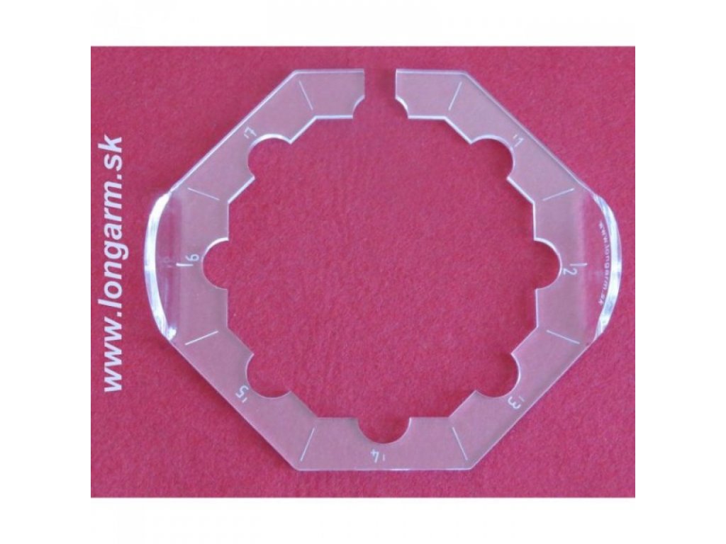 Všetky šablóny je však možné použiť aj samostatne bez quiltovacieho rámu. 2 rúčky quiltovacieho rámu sú prispôsobené pre dobré uchopenie rámu pri práci. Gumené protišmykové podložky na spodnej strane vodiaceho rámu zabezpečujú to, že quiltovaný sendvič, quiltovacie pravítko a rám sa pohybujú súčasne. Dvierka do vnútornej časti rámu majú polovičnú výšku. Rám má vyznačené osi v členení po 22,5 stupňa a jeho polkruhové úchyty na quiltovacie pravítka sú vzdialené 45 stupňov. Quiltovací rám 20 je vyrobený z najkvalitnejšieho materiálu. Hrúbka materiálu je prispôsobená ku výške vkladaných šablón tak, aby ich vrchná strana bola v jednej rovine s rámom. Vložené šablóny a quiltovací rám 20 spojte dočasne pri quiltovaní lepiacou páskou.